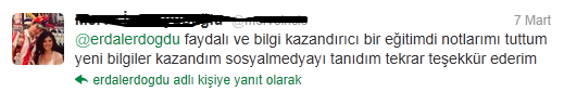 Gerek önceki sunumdan dolayı gerekse bize gelen sorulardan dolayı saatimiz biraz sarksa da arkadaşlarımızın firesiz dinlemeye devam etmesi hatta sunum bittikten sonra salon önünde de 1,5 saatlik bir soru cevap bölümü geçirmemiz arkadaşlarımızın bu konuya ne kadar ilgili olduğunu ve kendini geliştirmek için istekli olduğunu gösterdi bana ve mutlu etti. Bizim konuşmamızın konusu sosyal medya olunca geri bildirimlerimizin bir kısmını da sosyal medya üzerinden aldık.